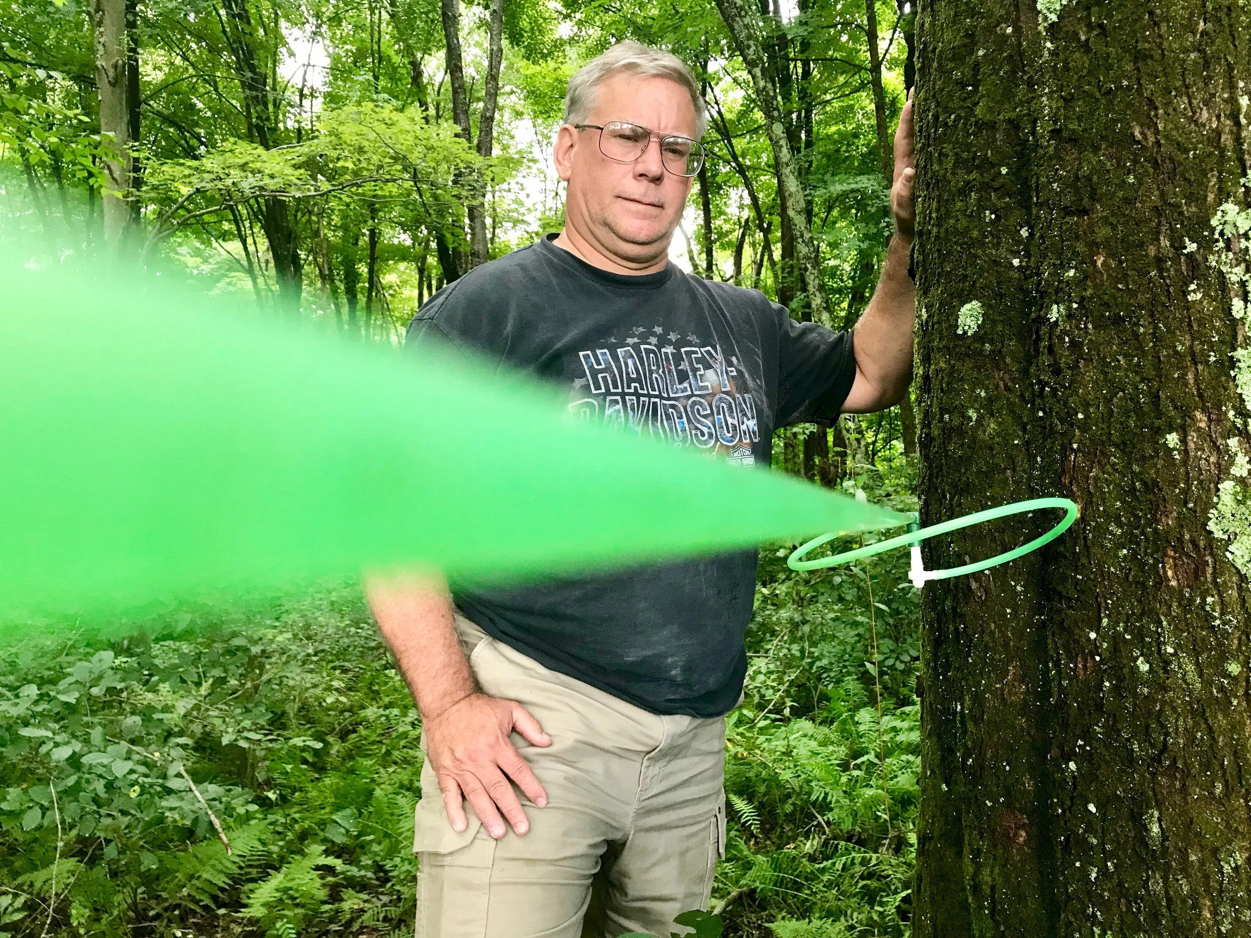 Keith Heasley, owner of Heasley Homestead in Bruceton Mills, W.Va., stands next to a tapped maple tree in the woods behind his home. The green tubing moves sap from the tree to a sugar shack elsewhere on Heasley’s property. He’s tapped about 1,400 maple trees near his home. | Photo by Jonathan Cribbs